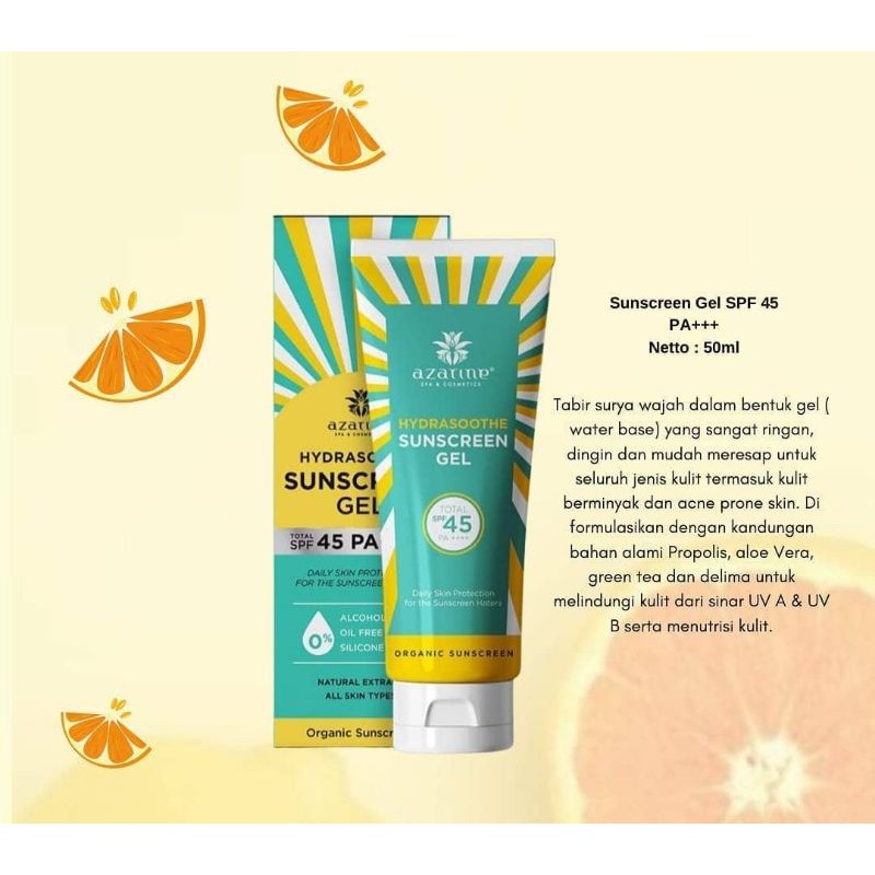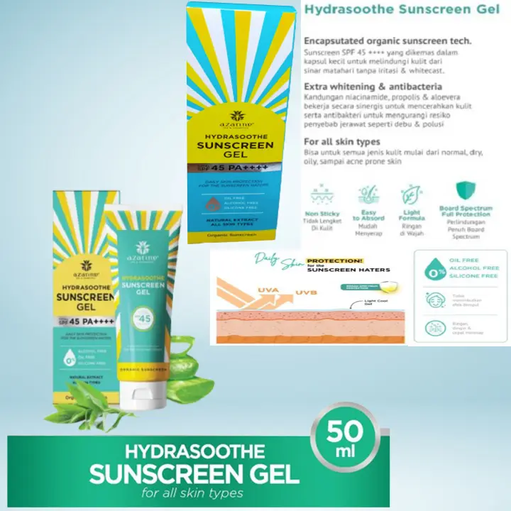 Dalam menggunakan sunscreen tentunya harus disesuaikan dengan jenis kulit baik sunscreen untuk kulit berminyak berjerawat kering sensitif maupun kulit kombinasi. Harga RESS RESMI FREE 3 GIFT AZARINE HYDRASOOTHE SUNSCREEN GEL SPF 45 50MLRp70987. Di formulasikan dengan kandungan antioksidan tinggi buah semangka air kelapa hijau dan buah delima untuk MENDINGINKAN MELINDUNGI dan MENUTRISI kulit dari paparan sinar UV matahari.