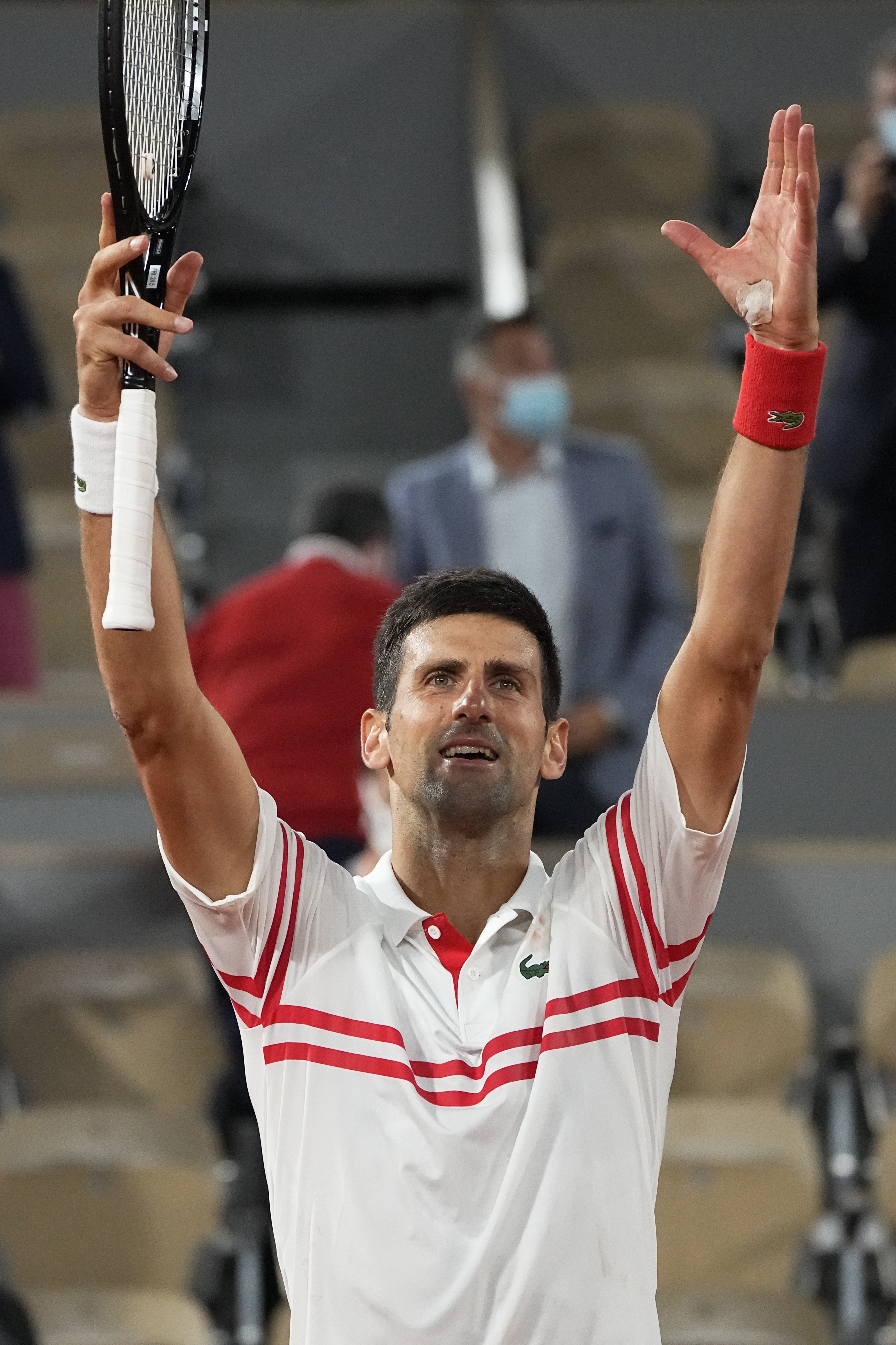 Novak je ispred zgrade snimljen u sportskom šorcu gornjem delu trenerke patikama i sa reketom u ruci. Klinci su odigrali partiju tenisa sa 1 teniserom sveta u Beogradu. Nakon sjajnog dočeka ispred njegovog restorana na Novom Beogradu slavlje rekorda se preselilo ispred zgrade Skupštine grada.